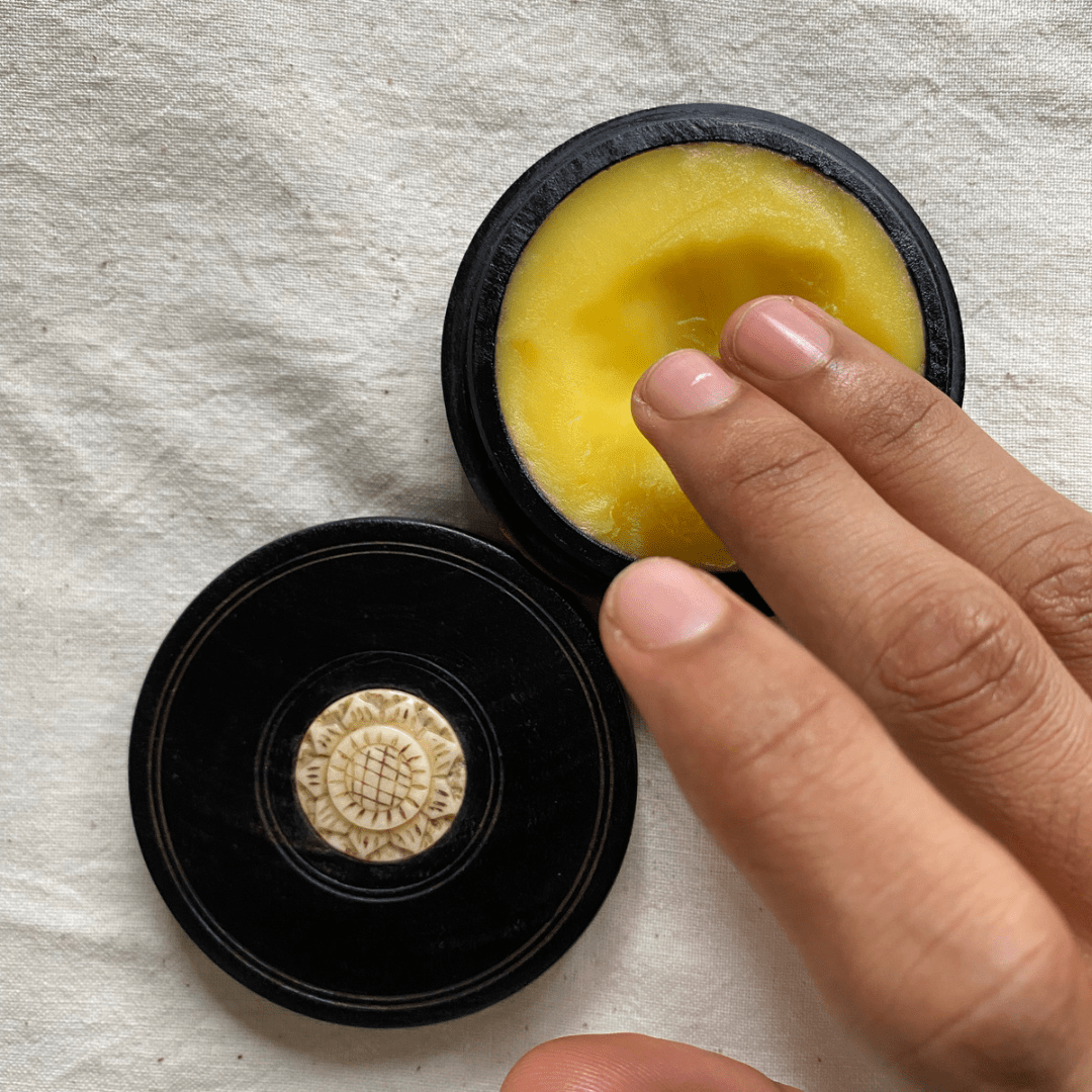 Top class Ingredients like cold pressed Almond and Coconut oil, bees wax, ghee , sandalwood oil, rose and saffron oil are used to make our lipbalm potion; making it rich, completely natural and safe to use.
